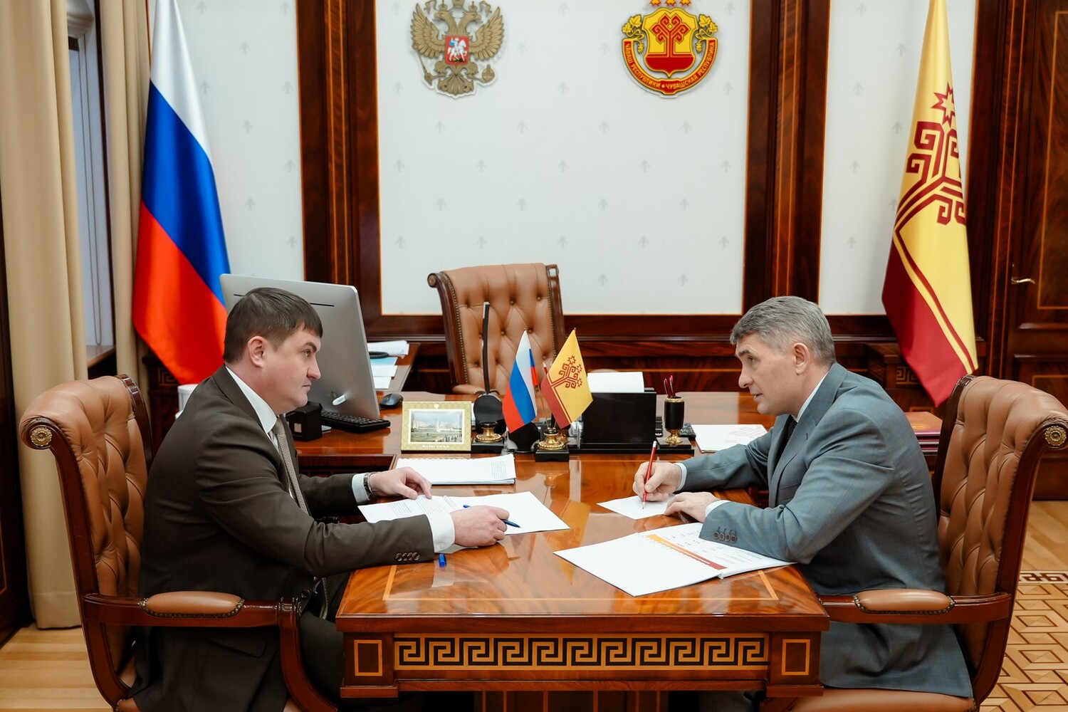 Глава Чувашской Республики Олег Николаев провел рабочую встречу с руководителем Государственной службы Чувашской Республики по конкурентной политике и тарифам Сергеем Егоровым.