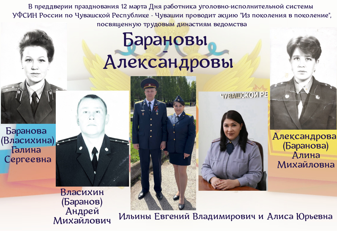 У истоков трудовой династии сотрудников уголовно-исполнительной системы стояла Баранова (Власихина) Галина Сергеевна. Она проходила службу на должностях медицинских специалистов ведомства. Будучи начальником медсанчасти цивильского следственного изолятора № 2 вышла на пенсию в звании майора.